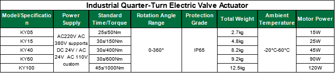 The Industrial Quarter-Turn Electric Valve Actuator provides precise automated control for quarter-turn valves such as ball and butterfly valves. It converts electrical energy into 90° rotational motion, enabling precise opening and closing or regulating of valves. Its compact structure, light weight, and precise control make it widely used in industrial automation.Supports flashlight-power switching mode.