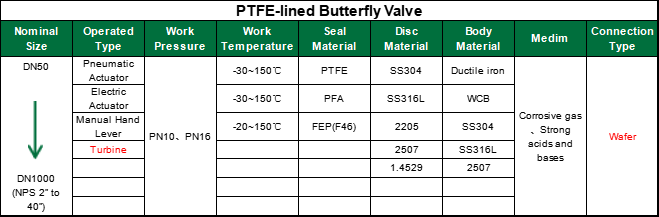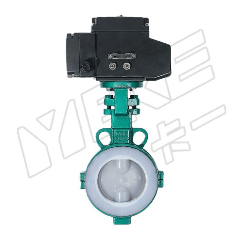 The interior body, disc edge, and flow path are fully lined with PTFE / PFA to protect against corrosive media.